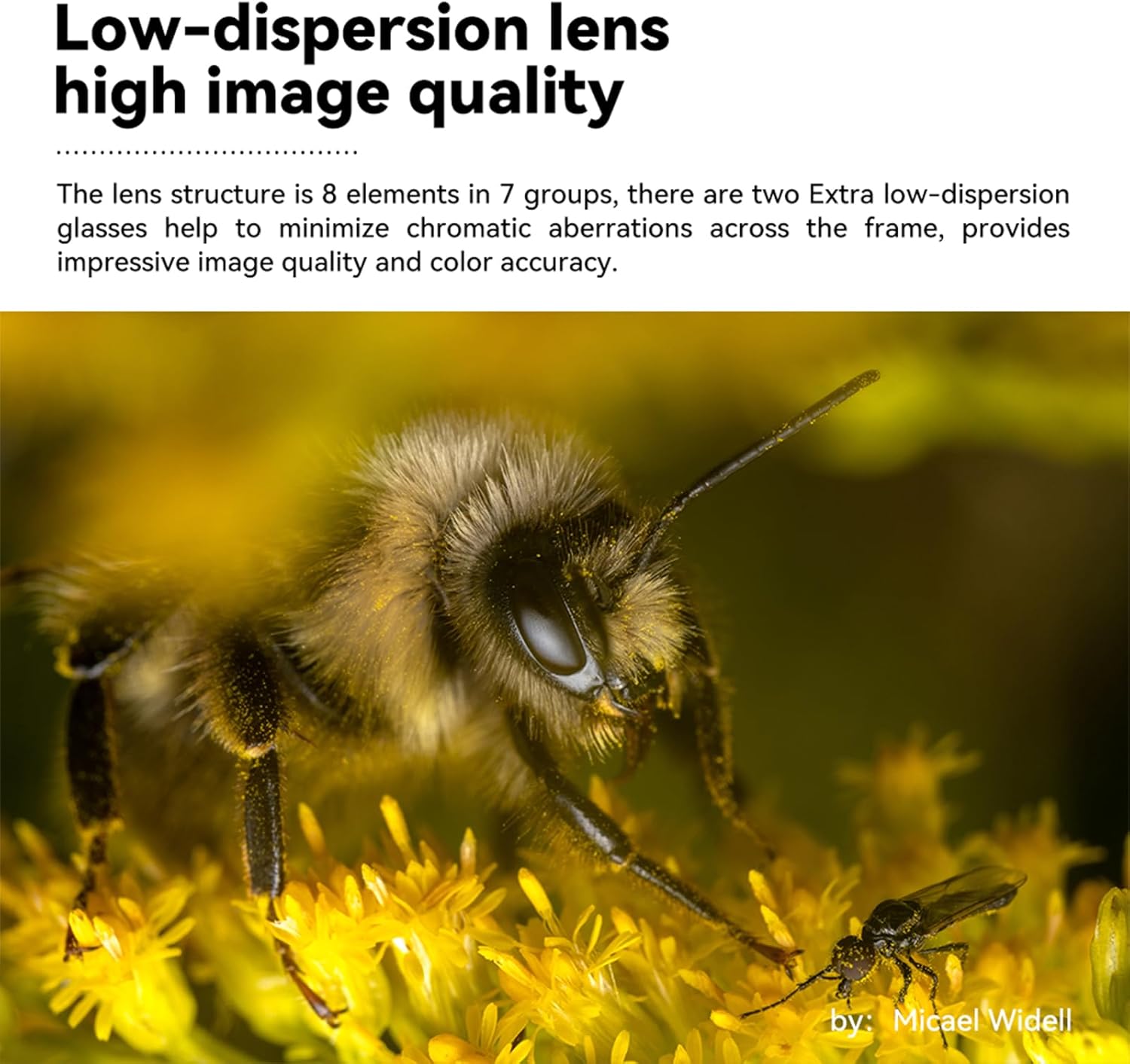 – **High-Quality Optics:** The lens features high-quality optics that reduce chromatic aberration and provide clear, sharp images with excellent color fidelity.